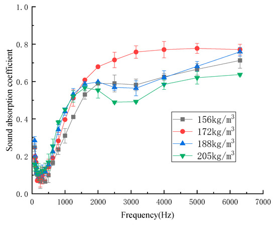 The sound-absorption properties depend on the density of the material [22]. To study the relationship between the sound-absorption properties and the density of the kapok fiber composites, the design densities of the composites were 156 kg/m3, 172 kg/m3, 188 kg/m3, and 205 kg/m3. Figure 5 shows the influence of the density of composites on the sound-absorption coefficient.
