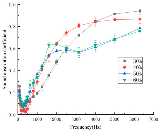 In order to investigate the influence of the mass fraction of kapok fiber on sound-absorption performance, the samples had the mass fraction of kapok fiber of 30%, 40%, 50%, and 60%. Figure 6 shows the influence of the different mass fractions of kapok fiber on the sound-absorption coefficient.