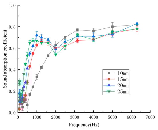 The thickness of the material plays an important role in the sound-absorption coefficient [24]. To study the relationship between the sound-absorption properties and the thickness of the kapok fiber composites, the thicknesses of the samples were 10 mm, 15 mm, 20 mm, and 25 mm, respectively. Figure 8 shows the influence of different thicknesses of kapok fiber composites on the sound-absorption coefficient.