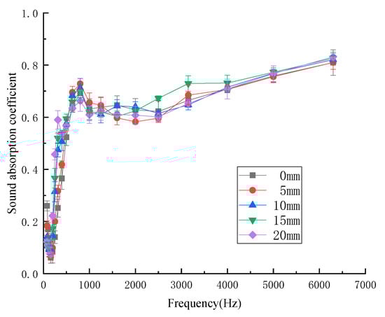 The thickness of the air layer behind the composite materials was a certain distance between the kapok fiber composites and the rigid wall. In order to investigate the influence of different air layer thickness on sound-absorption properties, air layers with different thicknesses (thickness 0, 5, 10, 15, 20 mm, respectively) were set behind the samples to test the sound absorption coefficient. Figure 9 shows the influence of air layer with different thicknesses of kapok fiber composites on the sound absorption coefficient. As shown in Figure 9, the influence trend of the air layer thickness on the sound-absorption properties was roughly the same as that of increasing the thickness of the composites, that is, with the increase in the thickness of the air layer of the sample, the peak value of the sound-absorption coefficient moved to low frequency, and the sound-absorption coefficient decreased at high frequency. Therefore, increasing the thickness of the air layer after the material was equivalent to increasing the thickness of the composites. The average sound-absorption coefficient of the air layer with different thicknesses of kapok fiber composites was 0.440 (0 mm), 0.460 (5 mm), 0.483 (10 mm), 0.498 (15 mm), and 0.520 (20 mm). When the thickness of the air layer was 20 mm, the average sound-absorption coefficient could reach 0.520.