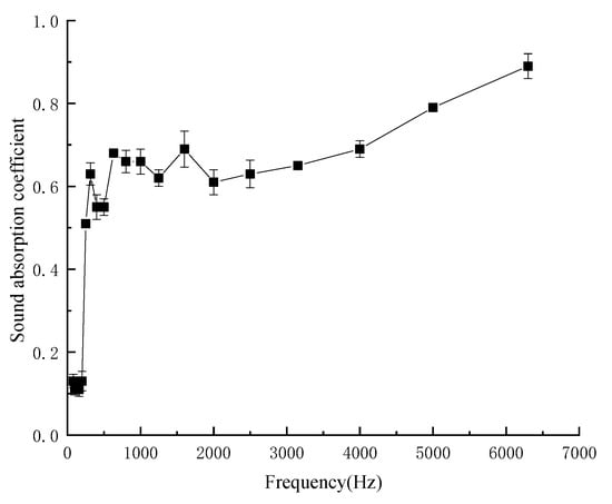 The test standards for sound-absorption properties are IS010534-2: 1998 and GB/T1869.2-2002, and the test method is the transfer function method. The test environment was set at a temperature of 25 °C, relative humidity of 65%, atmospheric pressure of 101.325 Pa, and sound speed of 346.11 m/s. The absorption property can be characterized by that average absorption coefficient average sound-absorption coefficient: the arithmetic average of six sound-absorption coefficients at frequencies of 125 Hz, 250 Hz, 500 Hz, 1000 Hz, 2000 Hz, and 4000 Hz.