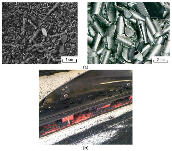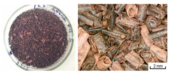 Two types of polypropylene (PP) were used as a polymer matrix to study the peculiarities of metallization and production of metal-filled composites: polypropylene brand Moplen HF501N (LyondellBasell, Houston, TX, USA) and polypropylene waste (Figure 1a), which is obtained as a result of mechanical processing of car interior panels. This processing was carried out to ensure the controlled destruction of the panels and was performed at the Technical University of Kosice (Kosice, Slovakia) (Figure 1b).