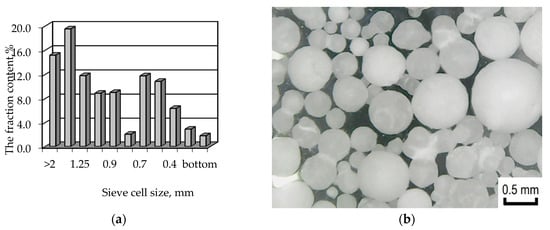 The sieve analysis showed that the polypropylene brand Moplen HF501N mainly consists of a fraction with a particle size greater than 1 mm (Figure 5), with a significant content of polymer fractions with a particle size of about 0.6 mm.