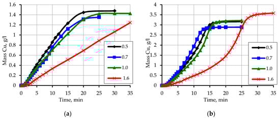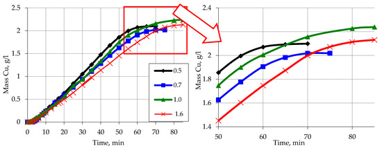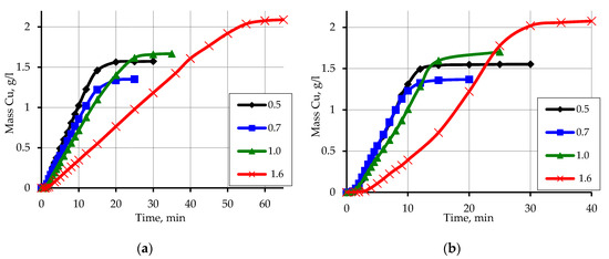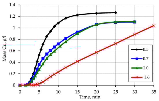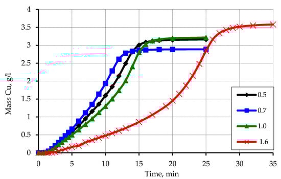 The recommendations on carrying out the process of copper plating of the activated waste of polypropylene can be formed based on the conducted research. The metal content of this waste can be adjusted by both the composition of the solution and the degree of loading of secondary raw materials. Also, to significantly increase the copper content in polymer waste, a method of multiple metallization of one polymer raw material can be recommended. In the case of using the method of re-metallization the layer of copper already formed on the surface of polypropylene is a very effective activator of the reduction process. Figure 16 shows the kinetic curves of copper ions reduction on the activated surface of polypropylene waste, which are similar to the recovery curves of copper ions on the model polymer.