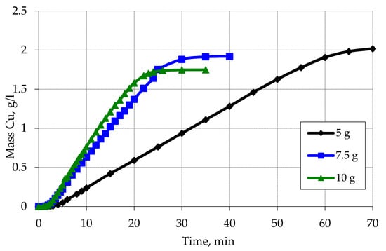 In addition to the change in the concentration of components of chemical metallization solutions, the influence of the degree of loading of activated polypropylene raw materials on the regularity of the copper plating process was also investigated (Figure 12). Washed activated polypropylene was used for this.