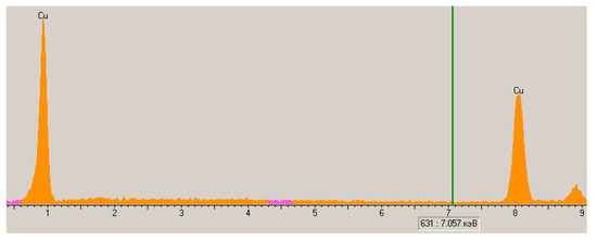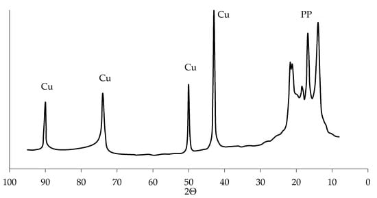 It should also be noted that the spectra of the characteristic X-rays of the surface of copper polypropylene do not have peaks corresponding to oxygen. This allows us to conclude that there are no copper oxides in the coating, which was also noted by other researchers who received a copper coating in EDTA-Na2 solutions of chemical metallization []. The absence of oxides in the copper coating is also indicated by the diffraction pattern of copper polypropylene with no peaks on that can be attributed to copper oxides (CuO (35°, 38°, 61°) and Cu2O (29°, 36°, 61°)). There are only peaks that are responsible for the crystal structure of polypropylene and copper on the diffraction pattern (Figure 15).