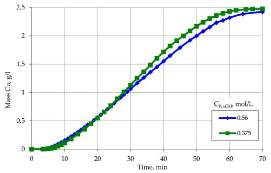 An increase in the concentration of sodium hydroxide to 0.56 mol/L affects some increase in the amount of reduced copper as a result of interaction with formaldehyde (Figure 7). In all cases, at a NaOH concentration of 0.56 mol/L, the reaction of copper ions reduction occurs to the end, as evidenced by the complete discoloration of the solution after metallization compared with the blue initial solution. Moreover, the discoloration of the solution occurs at the time of cessation of hydrogen evolution, which indicates that in the final stages of the reaction of copper ion reduction occurs due to interaction with formaldehyde.