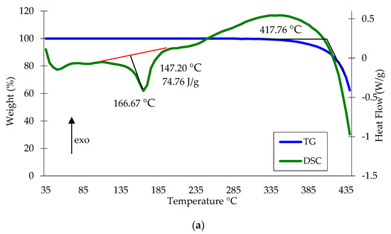 Differential scanning calorimetry and thermogravimetric analysis were performed for the polymer raw material and metal-filled composite using the SDT Q 600 (TA Instruments, New Castle, PA, USA) in an inert (argon) atmosphere. The heating rate of the samples is 10 K/min.