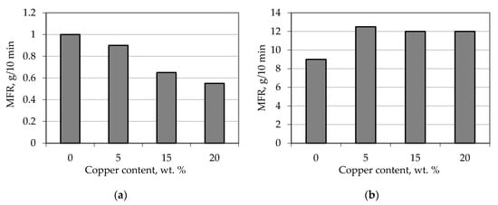 Dependence of MFR of metal-filled polypropylene composites on copper content. (a) T = 190 °C, P = 10 kg; (b) T = 230 °C, P = 5 kg.