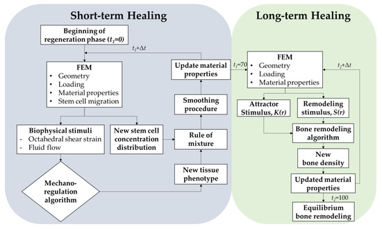 Figure 1 shows the flowchart of the current hybrid algorithm, including short-term and long-term bone healing models. The distribution of strain, fluid velocity, and stem cell diffusion in the initial model (t = 0) was firstly calculated by FEM. Granulation tissues then differentiated into various tissue phenotypes based on the mechano-regulation algorithm. Next, the rule of mixture and smoothing procedure [35] was applied to determine the updated material properties and the detail will be discussed in Section 2.2. After the short-term healing process finished, the distribution of tissue phenotypes and the corresponding material properties around the implants was obtained and assigned to the bone remodeling model at the initial state for simulating the long-term healing process. Where bone remodeling algorithm adjusted the bone apparent density of each element iteratively until the equilibrium state of the remodeling stimulus under the given loading condition was achieved. The procedures will be discussed in more detail in Section 2.2 and Section 2.3.