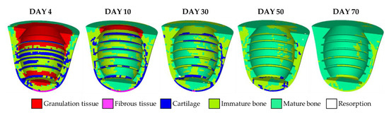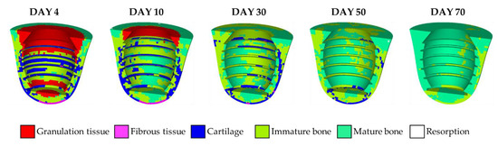 where = 10; is the current iteration number; is the effective material properties calculated from Equation (3). Note that when the iteration number is < 9, smoothing operation is applied to the iteration to the first [35]. The short-term healing time was set as 70 days, which is the average healing period for implantation surgeries [41,42,43]. The short-term healing process and the differentiated tissue phenotypes can then be predicted.
