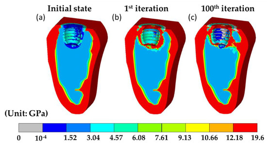 Since the current hybrid model was implemented by the finite element method, which can perform virtual tests on a wide variety of people characteristics and dental materials by simply changing the geometry of the model, boundary conditions, and material properties of bones. Thus, the current model can potentially provide estimated information and may even provide optimized dental implants for dentist clinics. Next, to demonstrate the applicability of the current model and reveal the effect of individual differences of the patients, we adopted the case of middle-aged male adults with higher strength material property of bone, referred to as to higher bone strength case. Where Young’s modulus of cortical, cancellous, immature, and mature bone was 1.4 times [52] than it in Table 1, while the properties of the remaining tissues, such as fibrous tissue and cartilage, stayed unchanged. Then, the short- and long-term bone healing processes were evaluated by the current model. The corresponding results are shown in Figure 7 and Figure 8, respectively. It was found that the trend of tissue differentiation in the short-term healing process was almost identical to it the standard case as shown in Figure 4. The only difference between the two cases was the averaged Young’s modulus in the high strength case was about two times higher than it was in the standard case, which can be seen in Figure 8a, where the material properties in the callus region were assigned according to the tissue differentiation result. In the 100th iteration, there were several significant differences between the two cases. Firstly, there was merely no bone resorption in the higher bone strength case. The volume fraction of bone resorption was at a value of 0.0068%. Secondly, the connective tissue bands in the higher bone strength case were thicker than in the standard case. The two features indicate that the bone system in the higher bone strength case can provide excellent supports and enhance the stability of the implant. This result also has good agreement with the clinical observation, where the dental implant failure rate for the middle-aged male adults was relatively low [53].