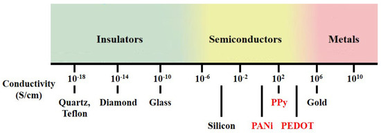 Polymers possess many advantages over other materials, as various chemical structures and adjustable surface functionalities are exploitable. Among synthetic polymers, conducting polymers (CPs) have received considerable attention since the initial discovery of polyacetylene in the late 1970s [1]. Unlike conventional polymers, which contain only single bonds () and are not conductive, CPs form a conjugated structure consisting of a series of alternating single and double bonds () along the polymer chain, which provides semiconducting properties. CPs constitute a class of organic materials with conductive properties similar to those of semiconductors, and the conductivity range of CPs is located between those of insulators and metals, as shown in Figure 1. The unique chain structure of CPs allows precise control of conductivity according to specific applications. The molecular chain structure of CPs can be conveniently modified by copolymerization or structural derivations. Moreover, CPs also exhibit various extraordinary properties, such as low cost, chemical reactivity at room temperature, low redox potential and good processability [2]. As a result, CPs are attractive as sensing materials for various gas sensor applications.