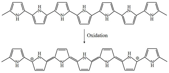 PPy can be utilized as a sensing material for the detection of NH, HS, NO and I by redox reactions. PPy undergoes electron transfer, and changes in resistance, conductance and work function occur. The process of electron transfer is different for different gases. When PPy reacts with electron acceptors such as NO, HS and I, electrons in the aromatic rings of PPy are removed, and the electric conductance of PPy is enhanced [5,6,7,8]. On the other hand, when PPy reacts with NH, which is an electron donor, PPy obtains electrons from NH, and the electric resistance decreases rapidly [9,10,11]. In particular, the resistance of PPy is recovered after exposure to N or air. The reaction processes of adsorption and desorption can be expressed as shown in Equation (1) and Figure 5 [12,13,14]: