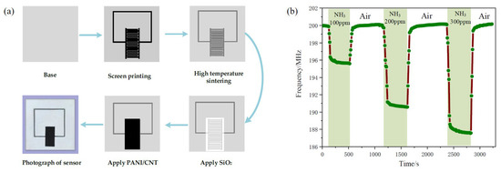 PANi is widely utilized for various gas sensors at radio frequencies. Shen et al. proposed a wireless passive gas sensor based on LC mutual coupling [72]. The interdigitated electrode-based LC resonator is designed to experience resonance at 213.6 MHz. PANi was synthesized with CNTs, and the PANi/CNT composite was located on the interdigitated electrode. The PANi/CNT-based gas sensor was fabricated as shown in Figure 8a. When the sensor was exposed to ammonia gas, the capacitance of the interdigitated electrode was changed, and a resonance frequency shift occurred. When the sensor was exposed to 100, 200 and 300 ppm ammonia gas, the resonance frequency shifts were 4.352 MHz, 9.235 MHz and 12.070 MHz, respectively, as shown in Figure 8b. It was demonstrated that the sensitivity of the PANi/CNT-based sensor is approximately 0.04 MHz/ppm under a concentration of 300 ppm, and the variation in the resonant frequency is large at a low concentration of ammonia gas.