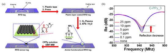 Characterization of the RFID-based ammonia gas sensor with C-PPy. (a) Schematic of the RFID sensor tag with C-PPy nanoparticles in the desired position. (b) Change in the reflection coefficient of the C-PPy-based RFID sensor tag. (Reprited with permission from [80]. Copyright 2016 American Chemical Society).