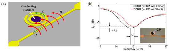 Kim et al. proposed an ethanol sensor based on a circular double split ring resonator (DSRR) loaded with PEDOT:PSS at 14.86 GHz [92]. When the end of the microstrip line was connected to the input source, a magnetic field was induced to the DSRR, as shown in Figure 11a. The PEDOT:PSS was coated inside the DSRR. The transmission coefficients of the sensor with/without ethanol gas are shown in Figure 11b. The 100 ppm ethanol gas was detected by the resonance frequency and transmission coefficient. According to the measured results, when the sensor was exposed to 100 ppm ethanol, the variations in the resonant frequency and transmission coefficient were 220 MHz and 0.79 dB, respectively.