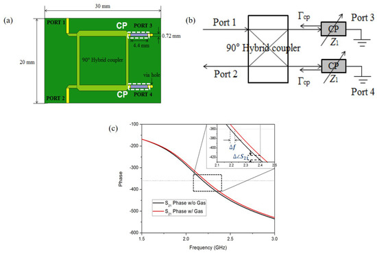 They also applied the PEDOT:PSS to the hybrid coupler, which is operated at 2.4 GHz [93], as shown in Figure 12a. As shown in Figure 12b, the transmission line with the PEDOT:PSS can be represented as variable impedance Z. When the ethanol gas molecules reacted with PEDOT:PSS, Z was changed due to adhesion of the ethanol gas molecules. Then, the reflection was changed, and 100 ppm ethanol gas could be detected by frequency and phase shift, as shown in Figure 12c. Consequently, when the sensor was exposed to 100 ppm ethanol gas, the variations in frequency and phase were 2.875 MHz and 9.09 degrees, respectively.