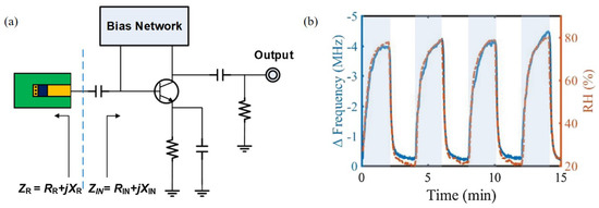 Kang et al. [94] designed an RF oscillator based on a negative resistance circuit with PEDOT:PSS at 916 MHz for relative humidity detection, as shown in Figure 13a. When PEDOT:PSS reacted with water vapor, both the conductance and capacitance of PEDOT:PSS increased. Thus, the oscillation frequency changed as the impedance of the sensing part varied. As shown in Figure 13b, the oscillation frequency decreased as the relative humidity increased. The variation in the oscillation frequency was 4.2 MHz when the relative humidity changed from 20% to 80%. Moreover, PEDOT:PSS reacted with water vapor in real time and showed outstanding results under the condition that the relative humidity varied dramatically with 1-min periods.