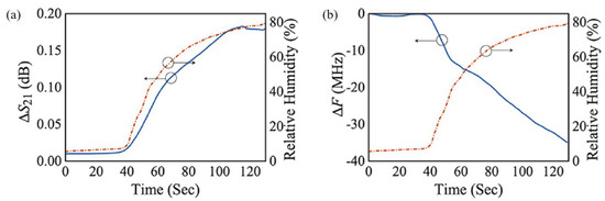 Measured results of the sensor. (a) Variation in transmission coefficient with change in relative humidity. (b) Variation in resonant frequency with change in relative humidity [95].