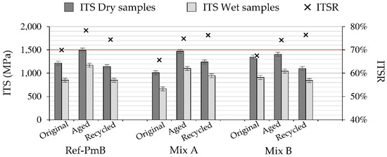 Analyzing first the overall performance obtained in the original state of the mixtures, the CR-modified mixtures resulted in ITSR values slightly lower to those of the control mixture. In this sense, further work would be required to optimize the CR-modified mixtures in order to meet the requirement established by the Swiss standard (ITSR > 70%). These results could be improved by modifying the mixture recipe or using specific additives to improve the adhesion between binder and aggregates. In terms of ITS, Mix B resulted in higher ITS values than reference and Mix A, indicating higher mixture cohesion [40].