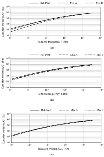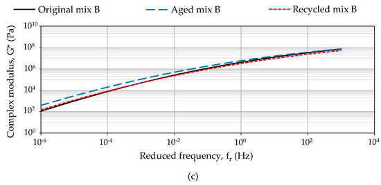 Complex shear modulus (G*) values of the recovered binder from (a) reference mixture, (b) Mix A, and (c) Mix B.