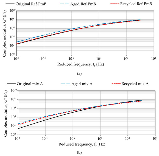 Moreover, a reduction in complex modulus for the PmB and the one extracted from Mix B was observed. This confirmed the positive softening effect caused by the use of rejuvenator that resulted in values near those obtained for the original mixtures. Nevertheless, this was not observed for the Mix A. Recently, it was discussed that a potential absorption of the rejuvenating agent by the CR particles could have a side effect on the response [42]. In this case, the addition of rejuvenator in the mixture modified with CR-A only resulted in a less significant reduction of the complex modulus. In this respect, it is difficult to establish a correlation between the results obtained for the mixtures and the results obtained from the binder tests. While the results from the mixtures suggested that both modified mixtures have a better resistance to aging than the reference mixture, the binder analysis confirmed that the type of CR could play a significant role regarding the elastic response added to aged mixtures, as well as the rejuvenator capacity to restore the binder properties to the unaged state.