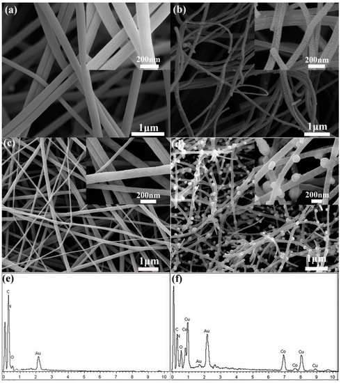 The surface morphology and microstructure properties of the as-prepared PAN NFs, PAN@CuCo2O4 NFs, CNFsm and CuCo2O4–CNFs are illustrated in Figure 1. The as-spun PAN NFs (Figure 1a) and PAN@CuCo2O4 (Figure 1c) nanofibers displayed smooth surfaces and 1D nanostructure, with diameters ranging from 100–200 nm and hundreds of micrometers in length. After calcination, the average diameter of CNFs (Figure 1b) and CuCo2O4–CNFs (Figure 1d) was reduced, whereas they still retained the original nanofiber feature. The size reduction of the nanofibers after annealing was due to the loss of polymer components in the process of annealing. Meanwhile, because of the collapse of the surface structure of the fiber, the smooth surface of fiber morphology became rough after annealing treatment. Moreover, the displayed surface of CuCo2O4–CNFs was much rougher than that of CNFs. It is well known that a rough surface is favorable to the diffusion of ions and enlarges the interface contact with the electrolyte in the electrochemical reaction process. Several bright nanoparticles with a size of about 100 nm (Figure 1d) were randomly distributed on the surface of CuCo2O4–CNFs, which were the main decomposition products of cobalt acetate and copper acetate. Both CNFs and CuCo2O4–CNF composite nanofibers revealed a porous three-dimensional network structure, which was favorable for electron transport and provided sufficient active sites for electrocatalytic reactions. According to the presented elemental analysis shown in Figure 1e,f evaluated by EDX (Energy Dispersive X-ray) spectrum, the presence of C, N, and O elements in CNFs (Figure 1e) and the existence of C, O, N, Co, and Cu elements in CuCo2O4–CNF composite nanofibers (Figure 1f) ensured the chemical constituents of corresponding nanofibers, which preliminarily confirmed the existence of CuCo2O4 nanoparticles decorated on the surface of the nanofiber. Nitrogen can be observed in both nanofibers, mainly due to the thermal decomposition of PAN after carbonization. As well known, nitrogen doping could significantly improve the electrical conductivity of carbon-based materials, which is conducive to the rapid transmission/collection of electrons during electrocatalytic reactions [3]. Thus, we believe that the prepared CNFs can be a desirable carrier for CuCo2O4 nanoparticle decoration, and the synergistic effect of CNFs and CuCo2O4 is beneficial to enhance the sensitivity of glucose detection.