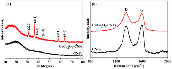 X-ray diffraction (XRD) (a) and Raman spectra (b) of CNFs (black) and CuCo2O4–CNFs (red).