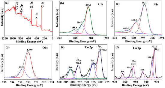 Wide-scan (a) and high-resolution X-ray photoelectron spectroscopy (XPS) spectra of CuCo2O4–CNFs at binding energies corresponding to (b) C 1s, (c) N 1s, (d) O 1s, (e) Co 2p, and (f) Cu 2p.