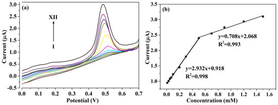 To enhance the sensitivity of the fabricated sensor, the differential pulse voltammetry technique (DPV) with excellent sensitivity was used to detect different concentrations of glucose. In Figure 6, the corresponding current responses of as-prepared PTBA/CuCo2O4–CNFs/GCE are recorded in an alkaline medium with the potential range of 0–0.7 V under the optimization conditions (Figure 6a). As shown in Figure 6b, the typical peak current–concentration response curve shows a dual linear region ranging from 0.01–0.5 mM with a linear regression of Ip (μA) = 2.932c + 0.918 (R2 = 0.998) and 0.5–1.5 mM with a linear regression of Ip (μA) = 0.708c + 2.068 (R2 = 0.993). The detection limit was estimated to be 0.15 μM (S/N = 3). The above results demonstrate that the as-fabricated PTBA/CuCo2O4–CNFs/GCE with favorable electrocatalytic properties could be used for the determination of glucose. Moreover, the PTBA/CuCo2O4–CNFs/GCE revealed superior analytical performance toward enzyme-free glucose detection compared with the previous literature. As shown in Table 1, our results are comparable to or stronger than those obtained other glucose sensors. In particular, the improved electrode has a lower detection limit than other sensors. This is mainly due to the low background current of the DPV detection method; thus, the DPV method has higher detection sensitivity and a lower detection limit in comparison with the widely used application method of amperometry. This demonstrates that the capability of the fabricated sensor for glucose detection was significantly improved.
