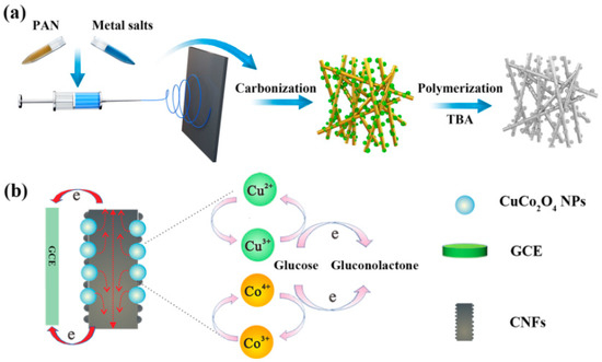 In particular, in comparison with other carbon supports [19,20,21], one-dimensional (1D) carbon fibers are regarded as a desired matrix material for dispersing active sites because of their attractive structure and electrical/mechanical performance [22]. Meanwhile, electrospinning has a broad application as a valuable and versatile method for the mass production of long polymer fibers with various precursors, with diameters ranging from tens of nanometers to a few micrometers. For electrospinning, by carefully selecting solvents, polymers, and metal precursors, a uniform mixture solution can be formed and then electrospun into composite fibers. Metal salts/polymer precursor fibers could also be converted into metal nanoparticles (NPs) or metal oxide-doped carbon fibers via pyrolysis treatment under an inert atmosphere. More importantly, loading and embedding metal or metal oxides in one-dimensional carbon fibers results in a three-dimensional mesh membrane with many exciting properties, including a large surface-area-to-volume ratio, good mechanical strength, high porosity, and desirable electrical conductivity. All of these factors prove that the electrospun 1D fibrous structure has great potential as a promising support for the decoration of electrocatalytic functional materials to fabricate sensor interfaces through improving the electron transportation or collection efficiency along its long axis, as well as facile functionalization. Additionally, the 1D nanostructure of carbon nanofibers (CNFs) plays a crucial role as a conductive pathway of CuCo2O4, accordingly decreasing the charge diffusion path and enlarging the contact area of CuCo2O4 with the electrolyte, which is conducive to the improvement of the electrocatalytic activity. Therefore, the development of CuCo2O4–CNF hybrids with excellent performance has crucial practical application value.