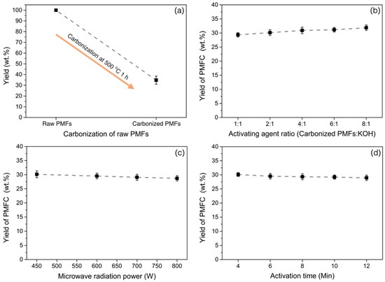 Figure 1a demonstrates the yield of carbonized PMFs at 500 °C for 1 h before further use in the activation experiment. The PMFs char yield is approximately 33.5 wt% owing to the decomposition of organic substances in biomaterial structures, which are commonly composed of cellulose, hemicellulose, and lignin. The influences of preparation variables on production yield of PMFCs are displayed in Figure 1b–d, respectively. In Figure 1b, an increase in an activating agent ratio tends to decrease the PMFC production yield because a rise in the activating agent ratio leads to a high activation degree. Furthermore, the carbon structure is more reacted and decomposed following the study of Shijie et al. [12]. They also reported that a higher activating agent ratio significantly decreased the yield of gulfweed activated carbons. Moreover, an increase in microwave radiation power obviously decreases the PMFC yield, as illustrated in Figure 1c. Foo and Hameed [40] showed the effects of microwave powers in a preparation of activated carbon from biodiesel solid residue. BET surface area might develop by enhancement of microwave power. The porous carbon yield is gradually decreased as a higher microwave radiation power serves more heat energy for the activation. Therefore, the carbon atoms are continuously consumed during the activation by thermal decomposition. Figure 1d displayed the effects of activation times on the PMFC yield. An increment of activation time achieves a reduction of PMFC yield until the activation time rises to 8 min. After 8 min, the PMFC yield was slightly decreased because of the completed activation between activating agent with carbon atoms [41].