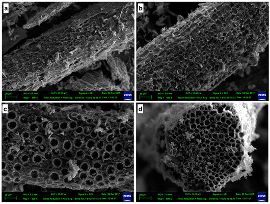 Scanning electron microscope (SEM) micrographs 500 μm: (a) PMFs char, (b) PMFC obtained at microwave power of 700 W for 4 min using 2:1 activating agent ratio (SBET = 911 m2/g), (c) external surface of PMFC obtained at microwave power of 700 W for 6 min using 2:1 activating agent ratio (SBET = 991 m2/g), and (d) cross section of PMFCs obtained at microwave power of 700 W for 6 min using 2:1 activating agent ratio (SBET = 991 m2/g).