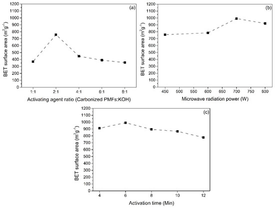 Effect of (a) activating agent ratio, (b) microwave radiation power, and (c) activation time on Brunauer–Emmett–Teller (BET) surface areas of PMFCs.
