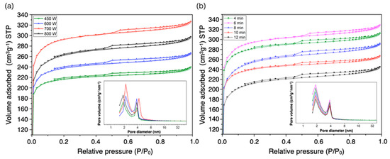 N2 adsorption and desorption isotherms and pore size distribution curves of PMFCs obtained at varied (a) microwave radiation powers and (b) activation holding times.