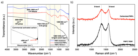 (a) Fourier transform infrared spectroscopy (FTIR) spectra of raw PMFs, carbonized PMFs, and PMFC and (b) Raman spectrum of carbonized PMFs and PMFC700-6-2:1.