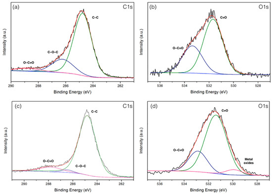 The surface chemistry composition of carbonized PMFs and PMFC with the highest specific surface areas (991 m2/g) was accomplished using XPS analysis. The obtained XPS spectra of prior to and after activation samples can be fitted in two enriched component peaks of carbon and oxygen corresponding to C1s and O1s spectra, as can be seen in Figure 6. Accordingly, the C1s spectra of the carbonized sample and PMFC are displayed in Figure 6a,c. The high resolution of C1s peak of carbonized PMFs can be revolved into three component peaks representing the peak of graphitic carbon (–C=C–, 284.75 eV), the groups of carbon in alcohol and/or ether linkage (C–O–C, 286.23 eV), and carbon in carbonyl group (O–C=O, 288.79 eV), with relative percentages of 75.76%, 19.50%, and 4.74%, respectively. Moreover, the C1s of PMFC exhibits 89.25% graphitic carbon (–C=C–), 2.43% C–O–C groups, and 8.32% O–C=O groups, respectively. The groups of C–O–C in carbonized PMFs are still a high fraction owing to incomplete devolatilization of oxygenated compounds at the mind carbonization temperature (500 °C). After the activation, the proportion of C–O–C tends to decrease, suggesting the elimination reaction of oxygenated components could occur and evaporate from the sample surface at a high temperature during the microwave-assisted activation stage; hence, pure carbon is presented [54]. These results are assured by proximate analyses, as seen in Table 3. On the other hand, O1s spectrum exhibits the two relevant spectra representing C–O in phenols and ethers groups and the organic C=O in carboxylic acid and/or ester group centered at 531.79 and 533.63 eV, respectively, as displayed in Figure 6b,d. Meanwhile, the O1s of PMFC was fitted into three components, that is, C–O in phenols and ethers groups of 73.08% (531.38 eV), the organic C=O in carboxylic acid and/or ester group of 21.80% (532.87 eV), and the high presence of ash of 5.11% in metal oxides (529.91 eV). The results from XPS analysis could possibly be used to indicate the significant different proportions of carbon and oxygen with agreement correlation of FTIR, proximate, and ultimate analyses.