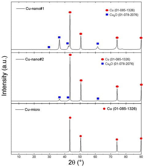 The as-obtained Cu-nano samples as well as Cu-micro were characterized by XRD, TEM/SEM and EDS (see Figure 1 and Figure 2). The results are summarized in Table 1. Two-phase constitutions, namely Cu/Cu2O, were observed by XRD for Cu-nano#1 and Cu-nano#2, while the Cu-micro sample did not contain any copper oxide. No other phases, such as CuO or copper carbonates, were detected in our nanosamples. According to the Rietveld analysis, the Cu-nano#1 sample had a very high oxygen content, 19.0 at.%, while the Cu-nano#2 sample contained 8.3 at.% of oxygen. Using the Scherrer formula [38] an estimation of average sizes of coherent scattering regions was also performed. The dimensions of these regions are usually considered to be the size of nanoparticles. Assuming core(Cu)/shell(Cu2O) structure of nanoparticles (see TEM results), the obtained values can be interpreted as a Cu core diameter of 30 nm with a 13.6 nm thick Cu2O shell for sample Cu-nano #1, and a 54.5 nm Cu core with a 9.5 nm Cu2O shell for Cu-nano #2.