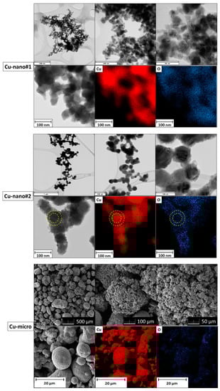 TEM/SEM micrographs and elemental maps are shown in Figure 2. In the Cu-nano#1 sample, spherical nanoparticles between 20 and 60 nm were found. According to EDS, copper and oxygen were detected. Let us note that also carbon was present due to the lacey grids. Elemental map of oxygen revealed a higher oxygen content on the surface of nanoparticles, suggesting a core-shell structure of partially oxidized copper nanoparticles. In the Cu-nano#2 sample, nanoparticle size was between 50 and 100 nm and the nanoparticles were also spherical. EDS confirmed a lower content of oxygen, being predominantly located on the surface of nanoparticles according to elemental maps (the core-shell structure is visualized by yellow circles in Figure 2). Micrographs of Cu-micro showed that the copper particle size was between 150 and 500 μm, with each particle consisting of many smaller grains with dimensions between 1 and 10 μm. According to EDS, a very low oxygen content was detected.