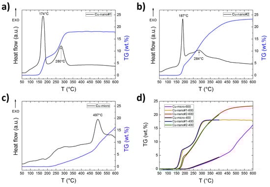 DTA and TG curves obtained by simultaneous thermal analysis (STA) for (a) Cu-nano#1, (b) Cu-nano#2, (c) Cu-micro and (d) comparison of TG curves measured to 400 and 600 °C.