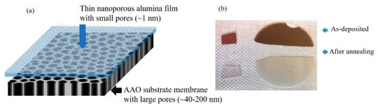 (a) Scheme of the material structure. Thin nanoporous alumina film (pore size ~1 nm) is deposited on the porous anodic aluminum oxide (AAO) substrate with large pores (40–200 nm). (b) Image of the prepared thin films deposited on porous AAO (right) and quartz (left) before and after annealing. The change in color is due to the evaporation of Ge out of the film during annealing.