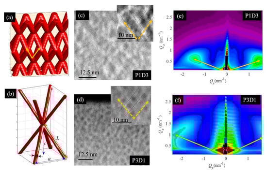 (a) 3D model of the nanoporous network. (b) Scheme of the main structural parameters of this network. (c,d) STEM-HAADF micrographs of the P1D3 and P3D1 films’ cross-sections, respectively, and (e,f) their grazing incidence small angle x-ray scattering (GISAXS) maps. The yellow dashed arrows indicate the direction of the nanopore ordering. The full yellow arrows indicate the positions of Bragg spots in the GISAXS maps that are related to the ordering of the nanopores in 3D networks.