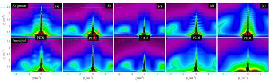 The GISAXS maps of all the investigated films before and after annealing (i.e., with Ge quantum wires and nanopores, respectively) are given in Figure 3. The first three films (Figure 3a–c) differ only by the film thickness (D1–D3), while the last two (Figure 3d,e) have different Ge sputtering powers (P2, P3), i.e., different pore arrangements and size properties. The side maxima in the GISAXS maps (Bragg spots) are at nearly the same positions for the first three films, showing the homogeneity of the structure, because these films differ only by their thickness. For the last two films, the spots become more elongated and more spaced, showing an increase in the disorder and a decrease in the lattice parameters of the formed 3D pore network.