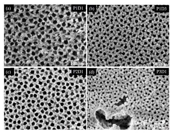The coverage of the larger pores (Side 2) of the AAO substrate by the films is shown in Figure 6. The films differing by the deposition time are shown in Figure 6a,b, and the films differing by Ge sputtering power are shown in Figure 6c,d. The pores are not fully covered in all cases; however, the pore sizes are strongly reduced for the longest deposition time (P1D3) and for the largest Ge sputtering power (P3D1). Since the reduction of the pore size is proportional to the film thickness, this technique can be applied for tailoring the pore size to desired value.