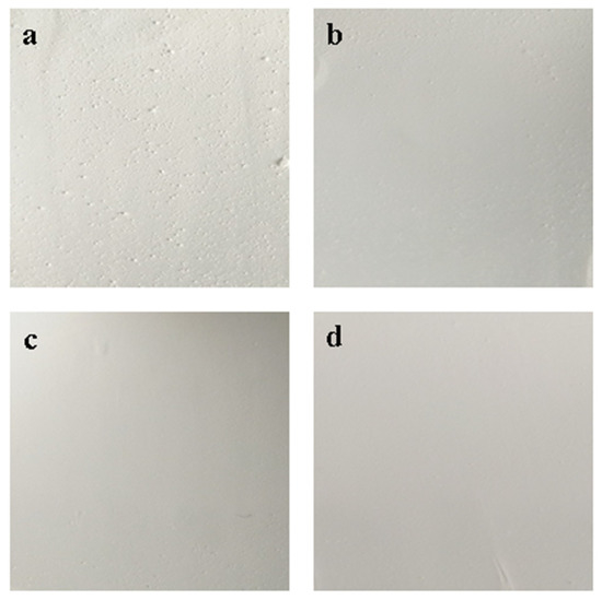 With the stirring time increased, the surface of bifunctional sheets became gradually smooth because it took a certain time for CA solution to be uniformly dispersed in the slurry. Short stirring time made it difficult for CA to unevenly disperse in the slurry and wrapped around the BaSO4 microspheres to form larger particles, resulting in a very rough surface of bifunctional sheets. Sheets also became fragile because of the protruding particles present on the surface of bifunctional sheets. As the stirring time increases, CA solution became uniformly dispersed, and an apparent smooth surface of bifunctional sheets formed (Figure 4a–d). Therefore, to prepare bifunctional sheets with a uniform and apparent smooth surface, optimal stirring time was 2 h at room temperature.