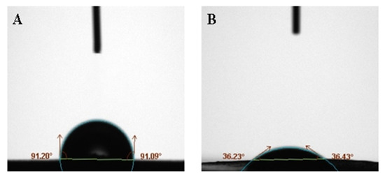 The wettability of the BaSO4 bifunctional sheet was characterized by a DSA 30 optical contact angle meter manufactured by KRUSS, Germany (DSA 30, KRUSS, Hamburg, Germany) [29]. The sample to be tested was fixed on the test platform, and droplet angle method was used, then the contact angle was read by a rapid photographic apparatus. Volume of liquid was 2 μL and rate of liquid dripping was 0.16 mL∙min−1.
