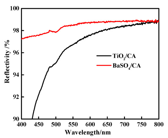 The light reflectance value of the BaSO4 bifunctional sheet was measured using a Lambda 950 reflectance spectrometer and results compared with the TiO2 bifunctional sheet prepared before were shown in Figure 7.