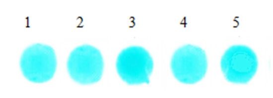 We added 6 μL serum with same concentration onto the surface of the 5 sheets, respectively, and detected at 670 nm. After reacting 5 min under 37 °C, 5 groups of reaction coloring results were obtained and are shown in Figure 8. The reflected light signal values of the 5 groups bifunctional sheets were measured by light reflection densitometer, and the results are shown in Table 3.