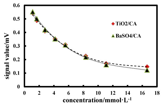 Figure 9 shows the standard curve of GLU-TiO2/CA and GLU-BaSO4/CA detection chips at different GLU concentrations. It can be seen that GLU-BaSO4/CA detection chip has a wider response range than GLU-TiO2/CA detection chip, especially in high concentration of 11.10~16.65 mmol∙L−1. Since BaSO4 bifunctional sheet has higher light reflectance value than the TiO2 bifunctional sheet (Figure 7), it can reflect more reflected light under high GLU concentration and be detected by the instrument. If less reflected light exceeds detection limit of the instrument, the signal value does not change significantly. Meanwhile, in a high concentration of 11.10~16.65 mmol∙L−1, the change trend of the ordinate signal value of GLU-TiO2/CA detection chip is not as obvious as that of GLU-BaSO4/CA detection chip, resulting in no obvious change in slope of the curve, which will decrease accuracy of concentration detection. So, GLU-BaSO4/CA detection chip has a wider response range.